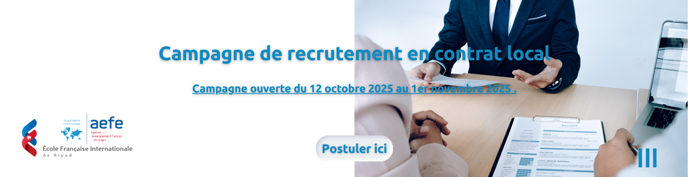 28 منهم تحت وضع التدريس المقيم/المعار. يتم تنفيذ المرحلة الأولى من التوظيف في المؤسسة: حيث يتم فحص الطلبات هناك بالتعاون الوثيق مع البعثة الدبلوماسية. يتم اتخاذ القرار النهائي من قبل مدير AEFE، دعمًا للعناصر المقدمة من اللجنة الاستشارية المشتركة المحلية. ويتقدم المعلم الذي تم تعيينه بطلب انتداب لمدة ثلاث سنوات ويوقع عقدًا مع AEFE.